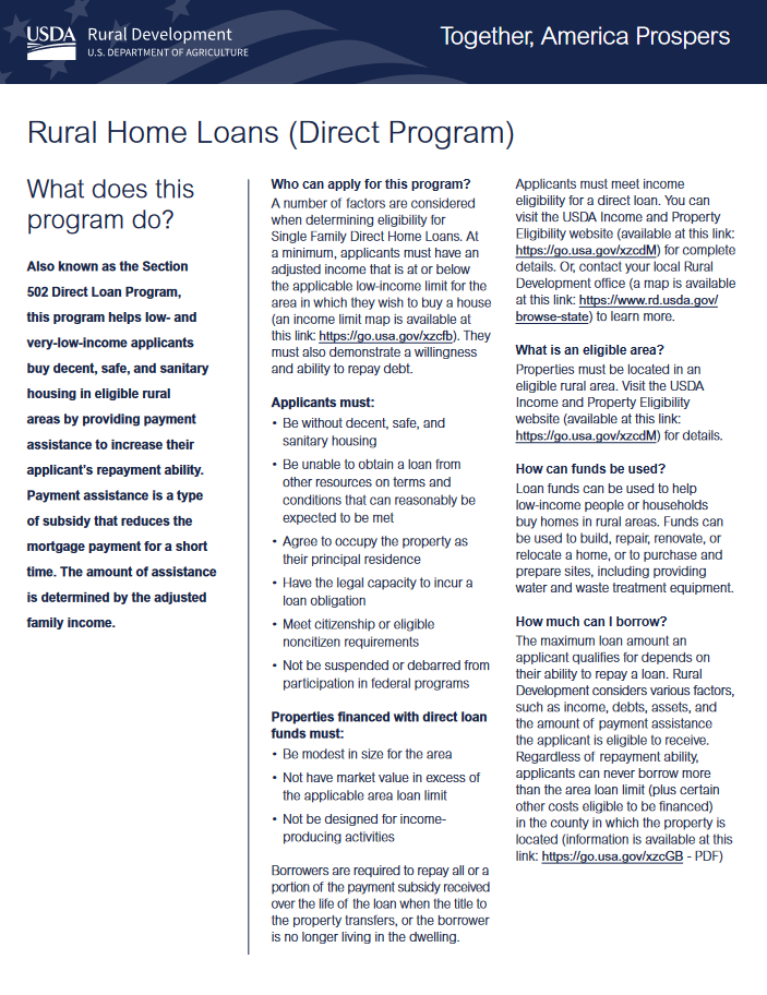 Yes! Section 502 Loan Programs from the USDA provides pathways for home ownership and aims to improve the quality of life in rural communities. The USDA provides two programs for Single Family Housing: the Single Family Housing Direct Home Loan and the Single Family Housing Guaranteed Loan Program. Both of these programs assists low- to moderate-income applicants obtain decent, safe and sanitary housing in eligible rural areas by providing financial assistance. Below are the programs and the differences between them.